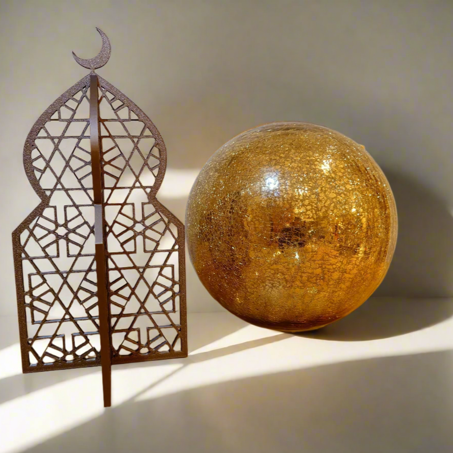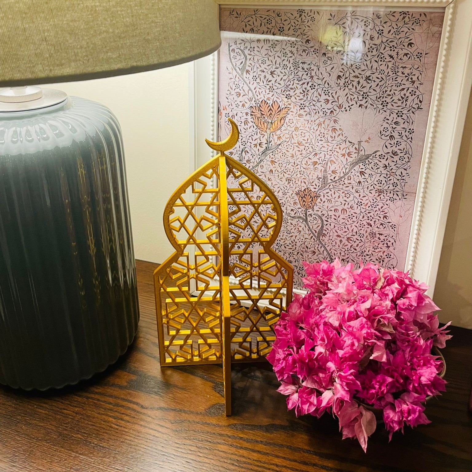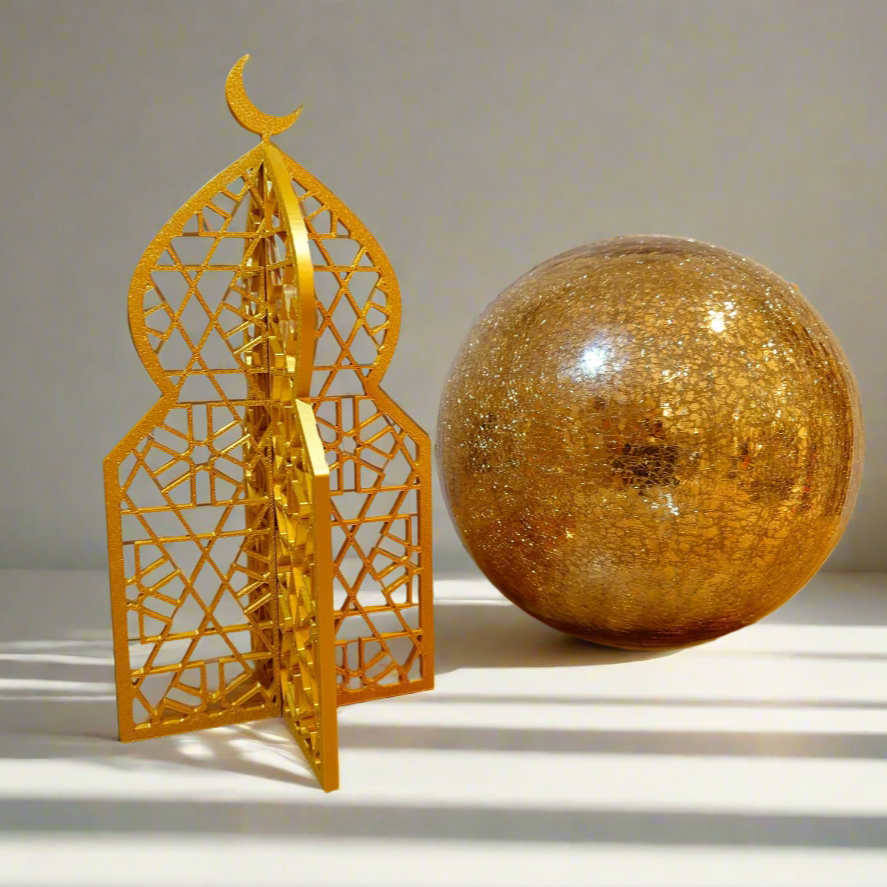 Get into the festive spirit with this quirky Mosque Kit! Made with 2 pieces of metal-like material, featuring an Arabic arch and intricate designs, it's perfect for Ramadan, Eid, or year-round decoration. Easy to assemble and versatile, it will add a warm and charming touch to any space. Measurements: 24.5x12.5x12.5cm.